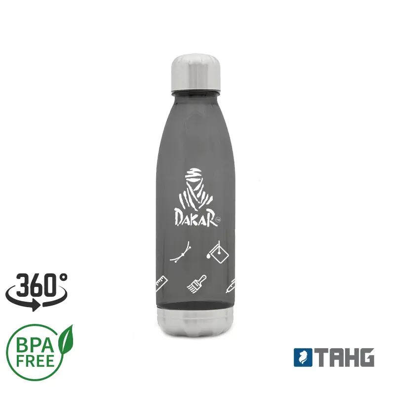 Botella realizada en pet con base y tapa a rosca de acero inoxidable.