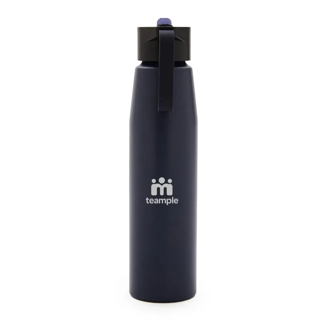 - Botella Jim. Botella de aluminio de 700ml con tapa de PP negra a rosca con boquilla de PS y sorbete PE. Cuenta con una correa de silicona a tono con el color elegido para facilitar el agarre.