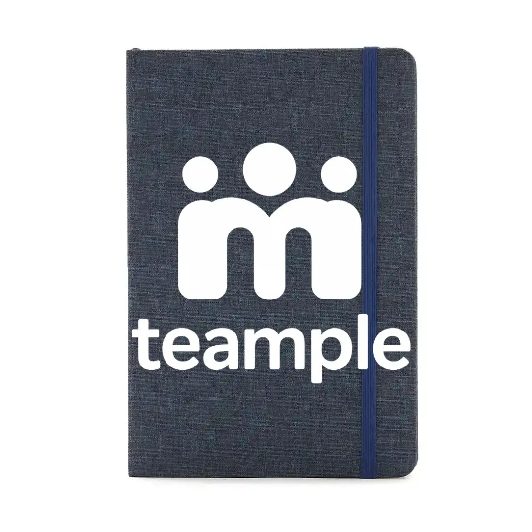 - Cuaderno con tapa de tela 300D en dos tonos. Hojas internas de 70 gramos, con 80 hojas en formato rayado. Dimensiones: 14 x 21 x 1,4 cm.