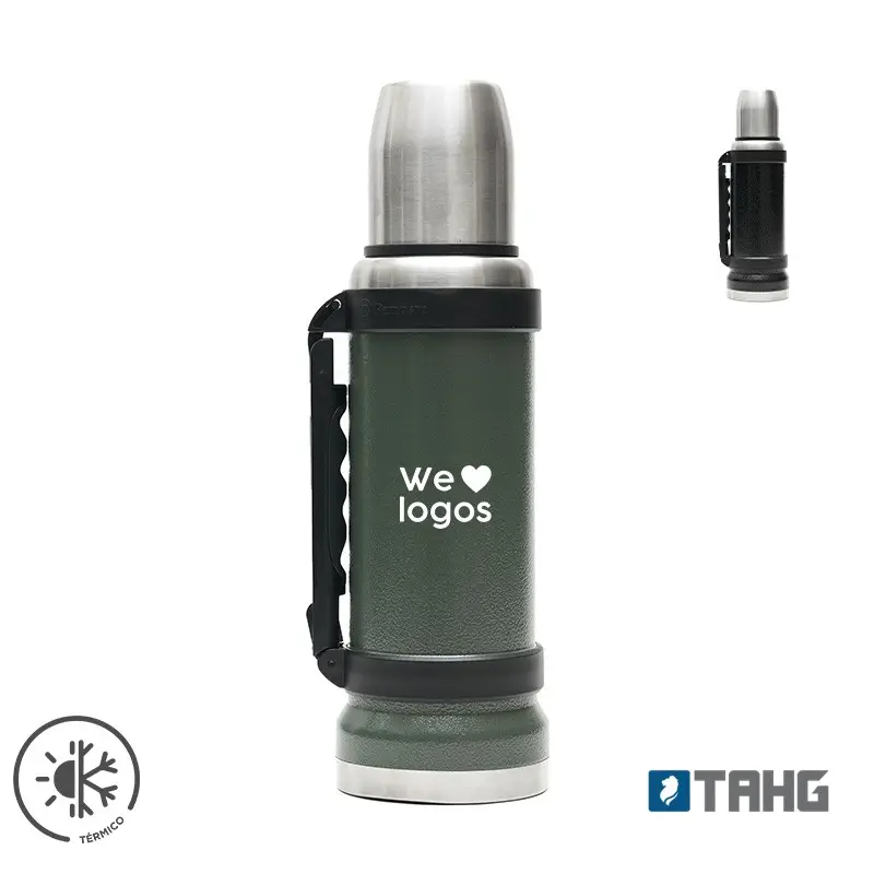 Termo de acero inoxidable 304, recubierto con esmalte especial que protege de ralladuras y golpes. Puede mantener el contenido a la misma temperatura durante 18hs, gracias a su doble pared aislante especial de acero. Cuenta con un tapón cebador Hermético a rosca con la función anti derrame y tapa con superficie plana estable para usar como taza o vaso y manija plegable para facilitar el transporte. Presentado en caja de cartón. Medidas del termo: 34 cm x 10,5 cm. Medidas de la caja: 35 x 11 x 11 cm. Capacidad: 1,1 Lts.